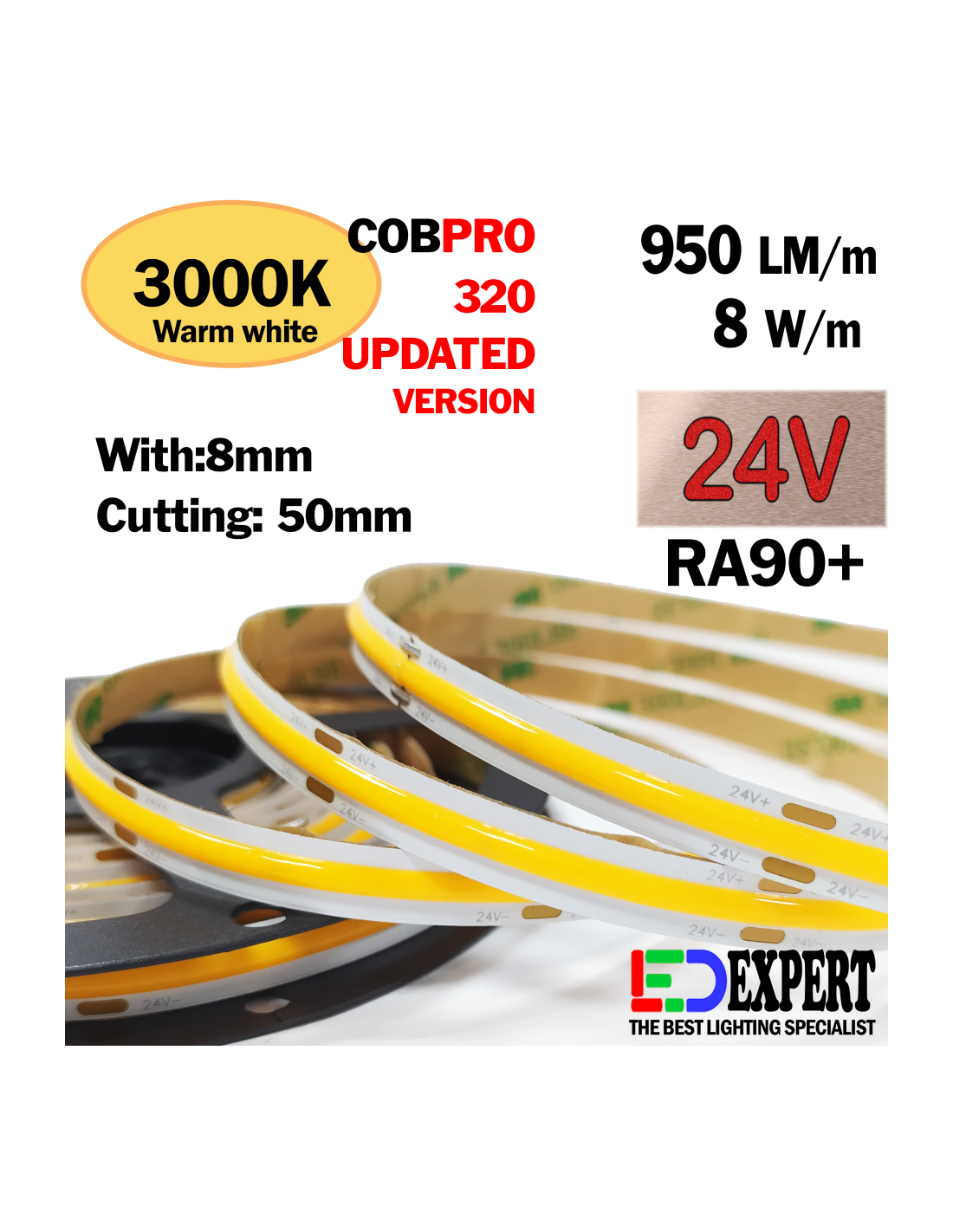 5m COB-PRO WARM WHITE - 3000K - 24V COB LED Strip - RA90+ 950lumen/m - 8mm