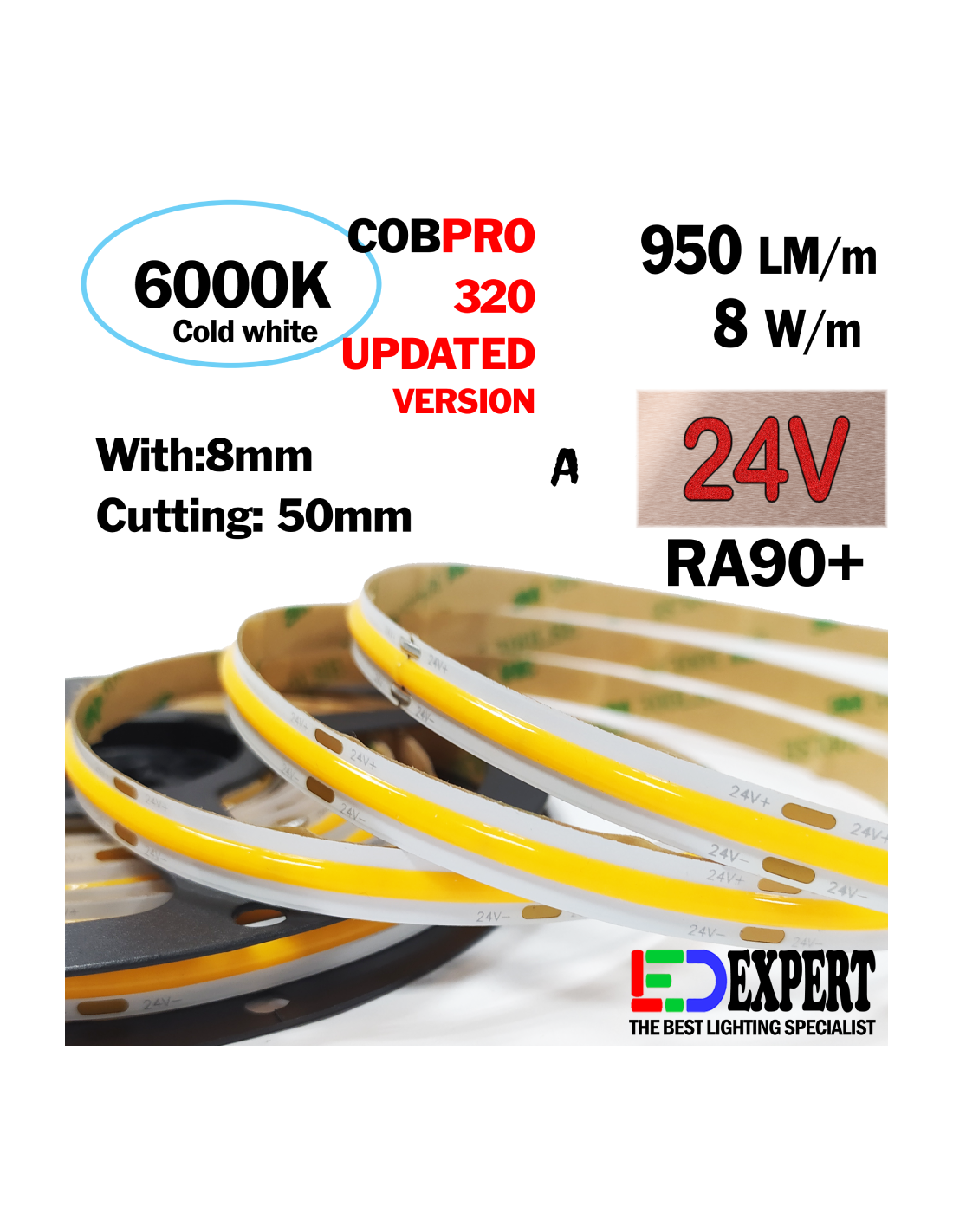 COB-PRO 8mm COLD WHITE - 6000K - 24V COB LED Strip - RA90+ 950lumen/m