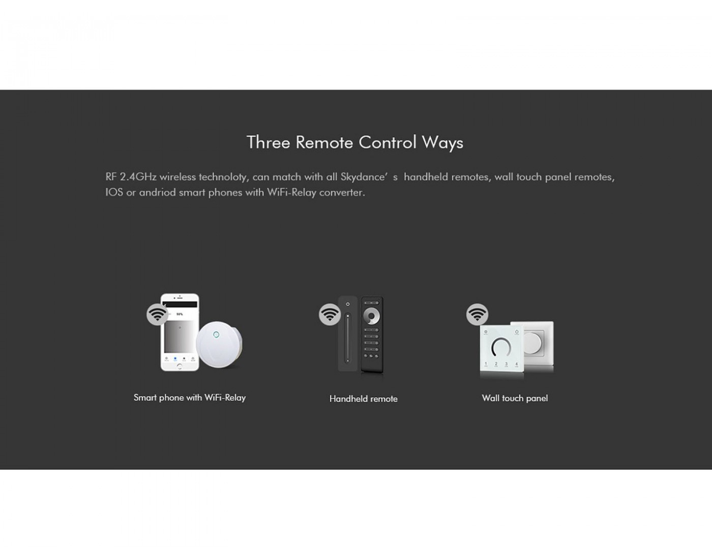 - Working with Premium remote controllers, RF Wall switches, push dim switches or Wifi Controller (at the same time)
