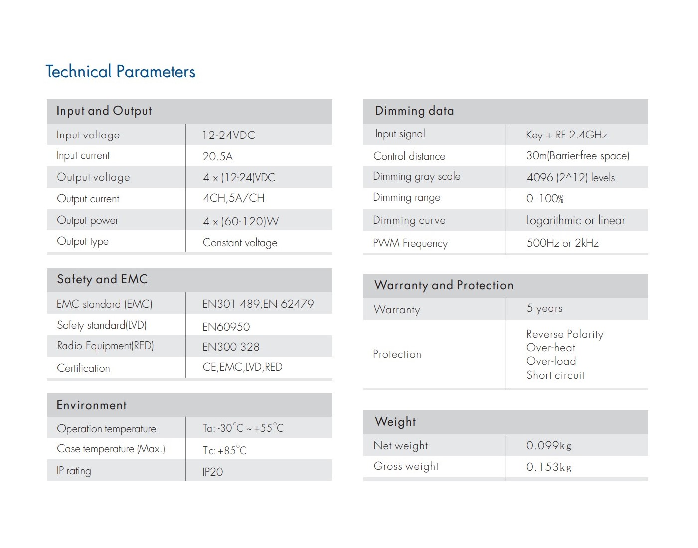- Can be used with RGBW, RGB, CCT and single color LED strips