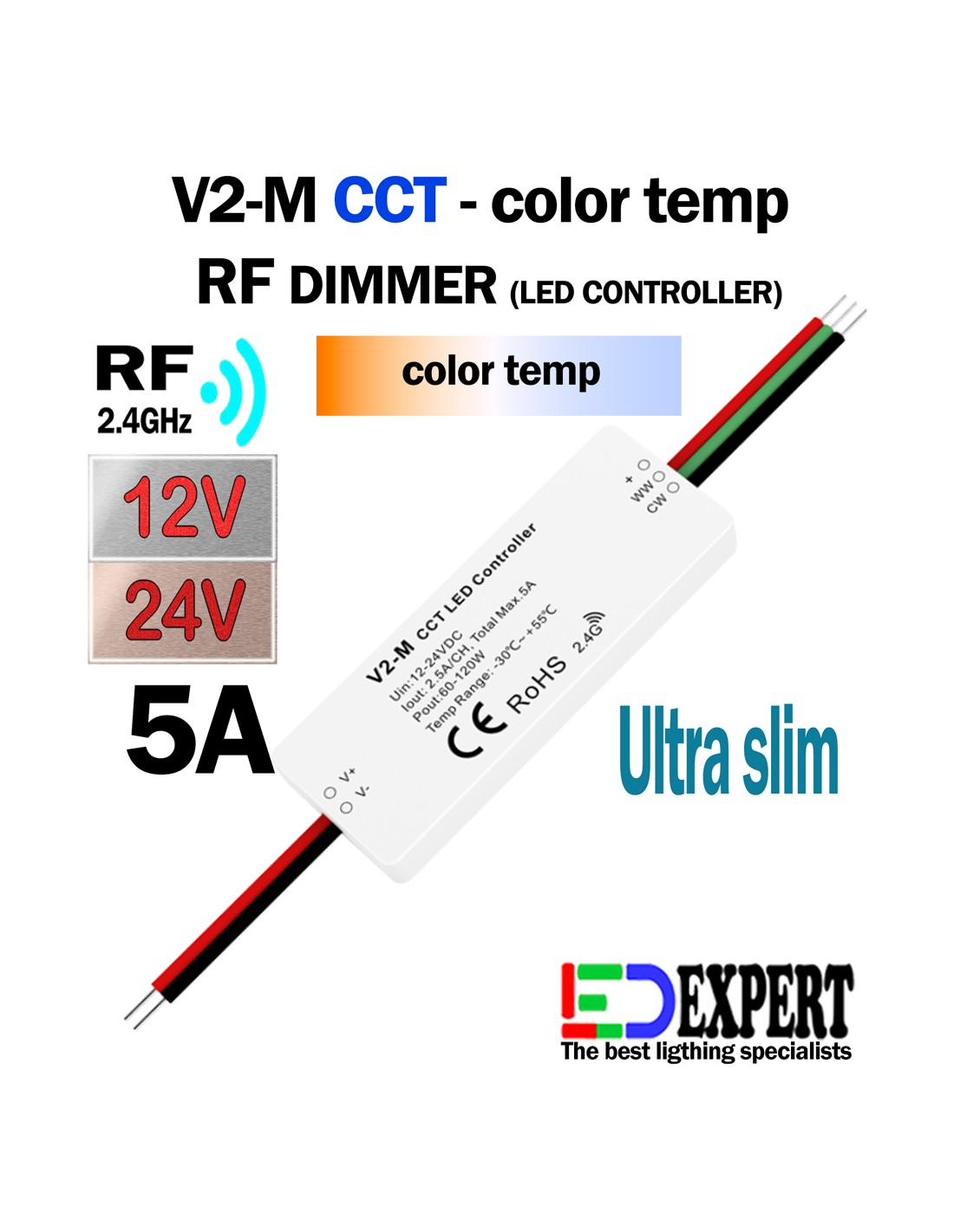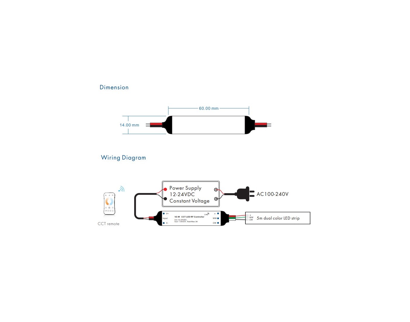 - Controls two channels: 1 zone of CCT LED strip (or single color LED strip)