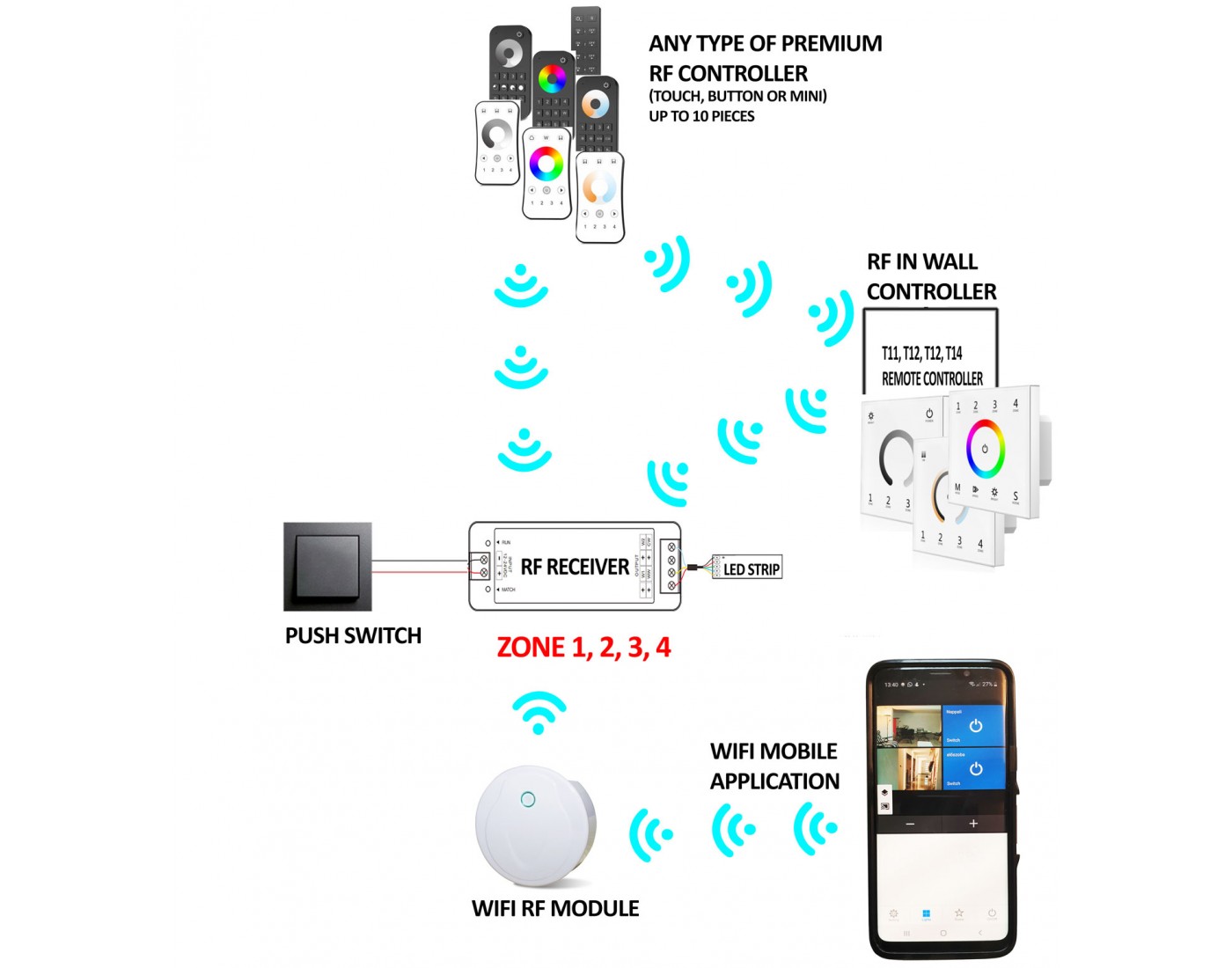 - This unite can be paired with up to 10 RF remotes (handheld, wall, smart mobile remotes)