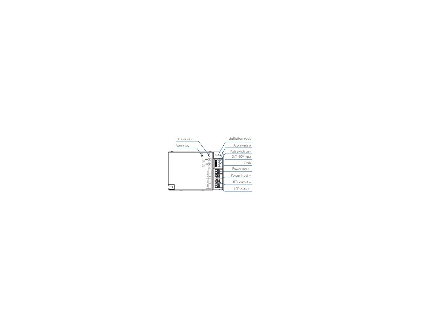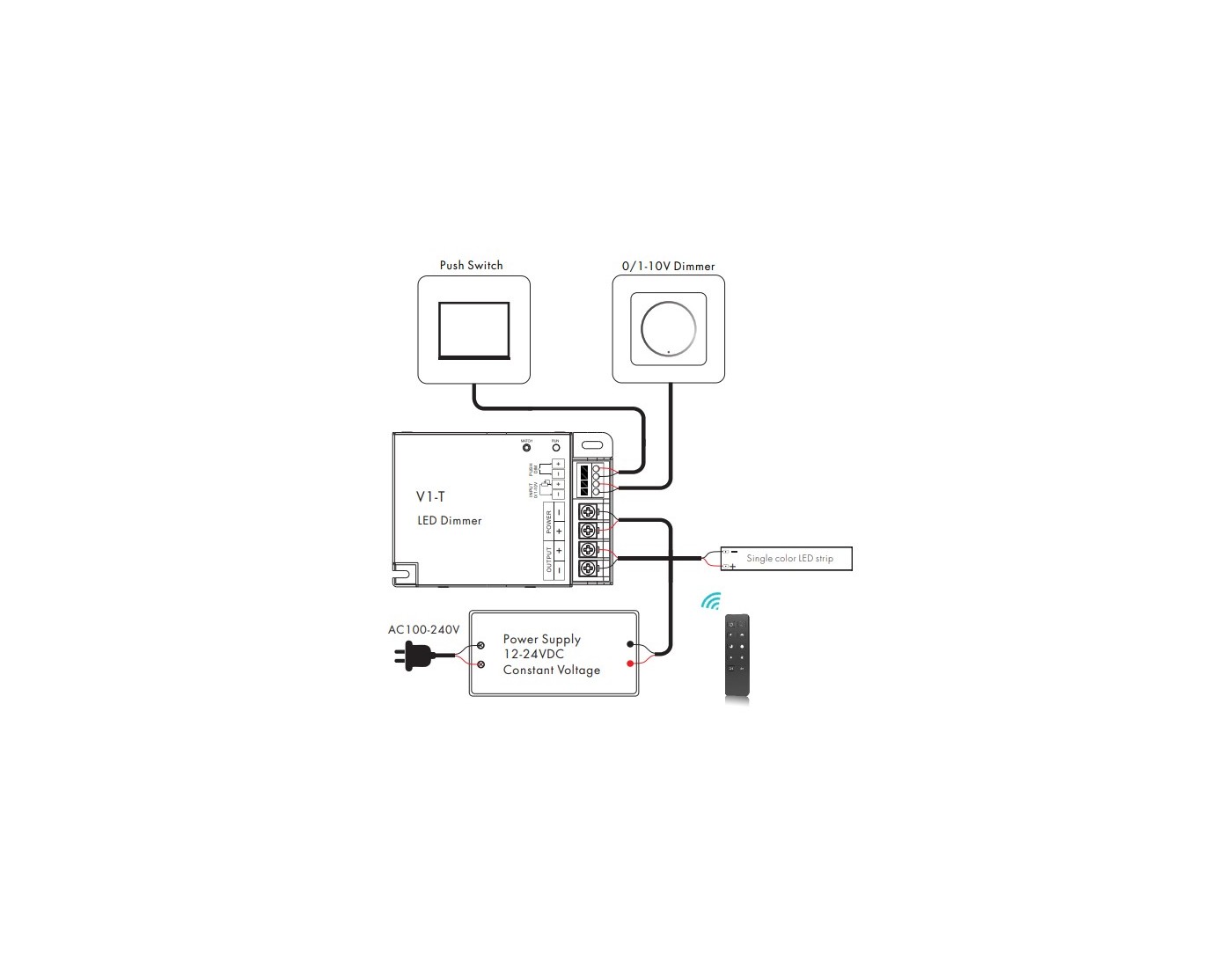 - Connect with external push switch to achieve on/off and 0-100% dimming function.