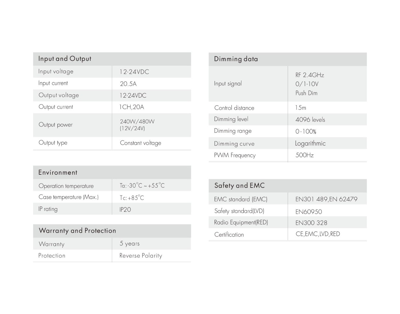 - 20 Amper current (240W at 12V, 480W at 24V)