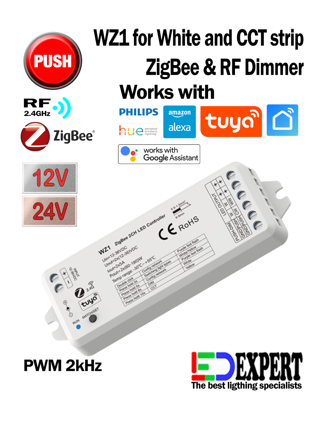 Press and hold match/set key for 8s, until the RUN LED indicator turn white, then release, the controller will become DIM type, then do smart cong by Tuya smart APP, or short press match key to match with dimming RF remote.