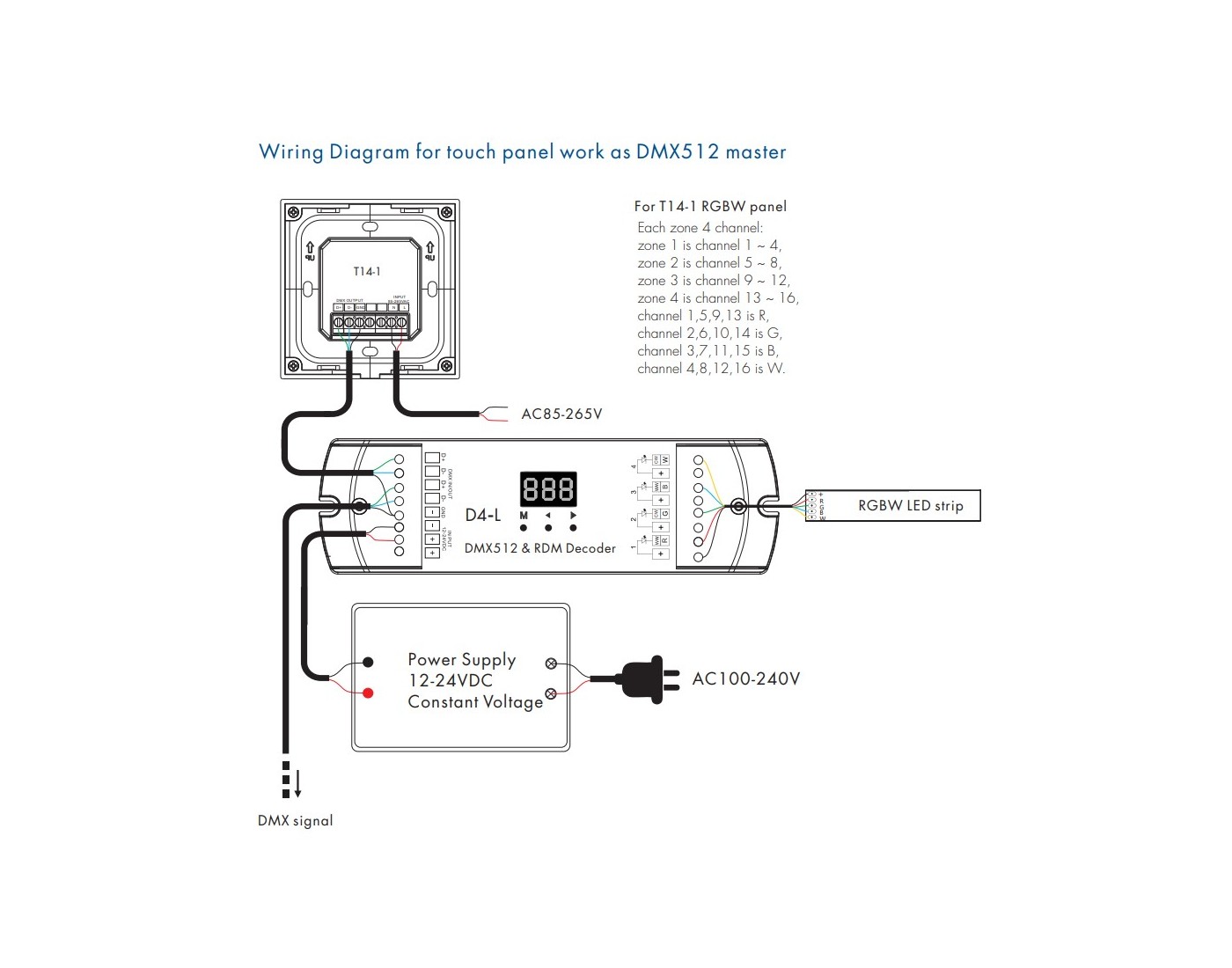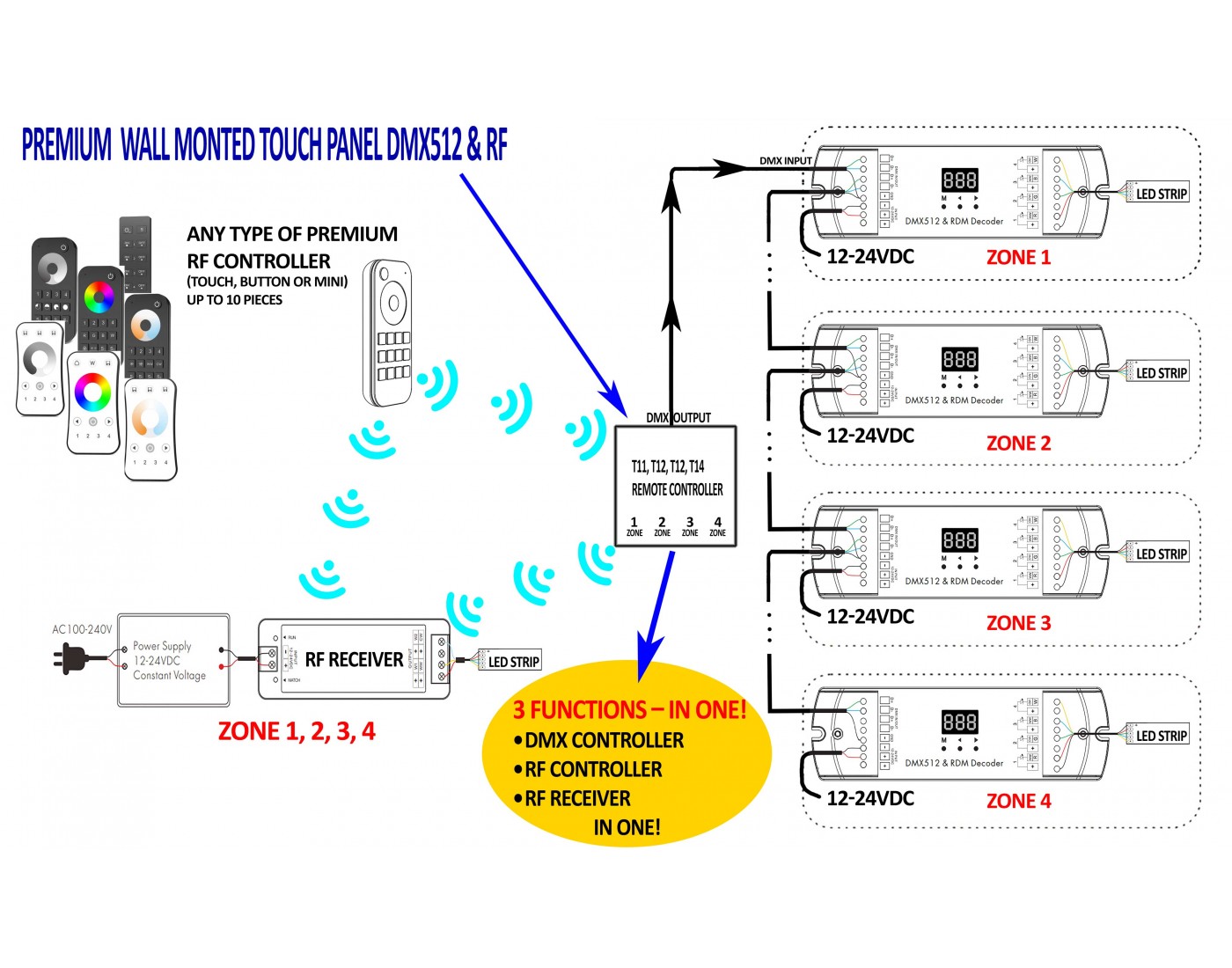 PREMIUM In wall 4 Zones RF Touch Panel can control 4 zones through RF and/or DMX512 cable connection.