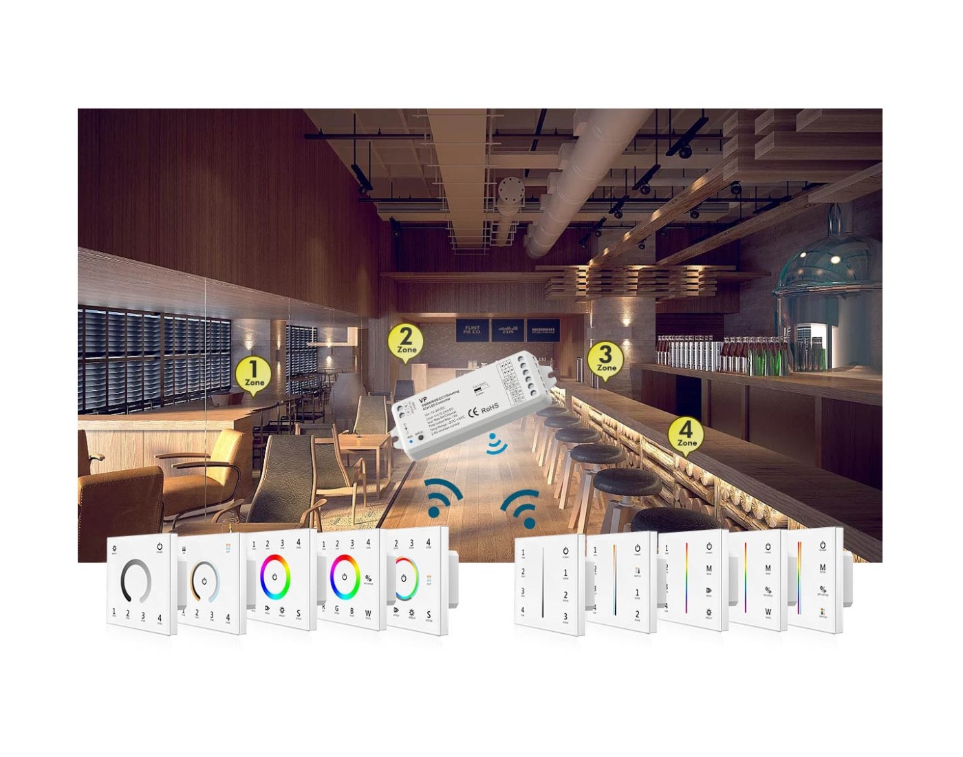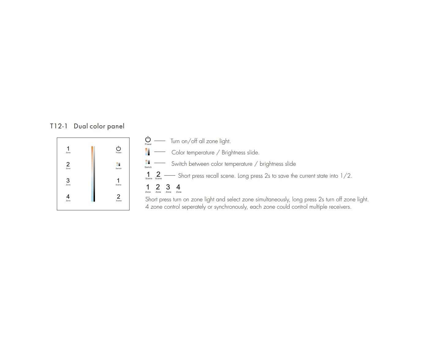 - Controls 4 zones of DUAL COLOR LED Light strips and RF Sockets (on, off, brightness and color temperature with LED strips).