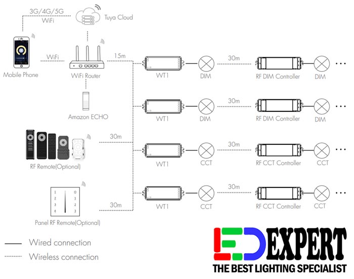 - Each WT1 controller can also work as WiFi-RF converter, then use Tuya APP to control one or more RF LED controller or RF LED dimming driver synchronously.